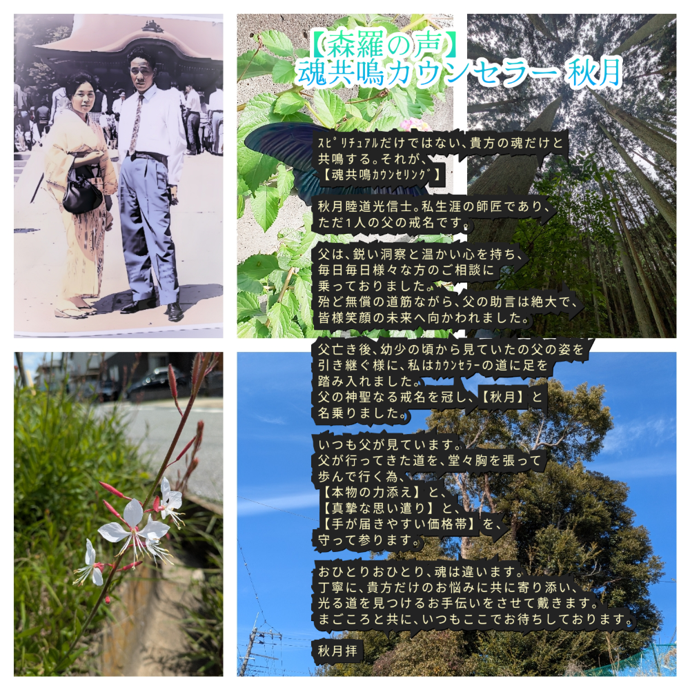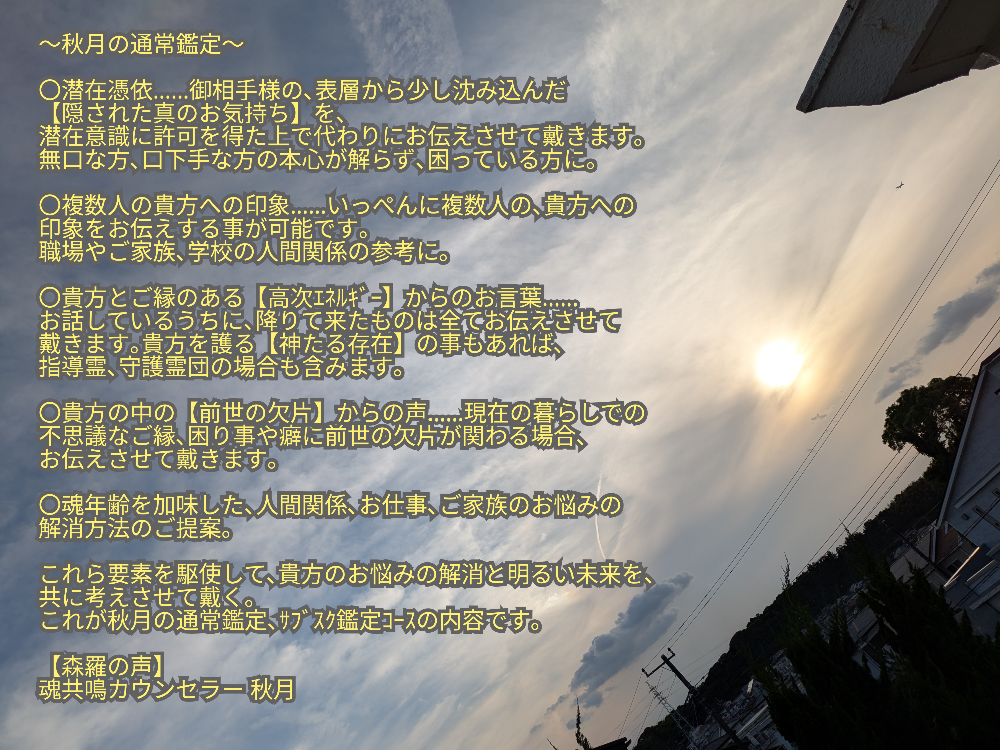 環境、人生、過去の姿も、守護の存在も、全てが今の貴方を形作っています。現実世界×スピリチュアルの、ベストバランス。【地に足の着いたスピリチュアリスト】秋月が、お力添えさせて戴きます。